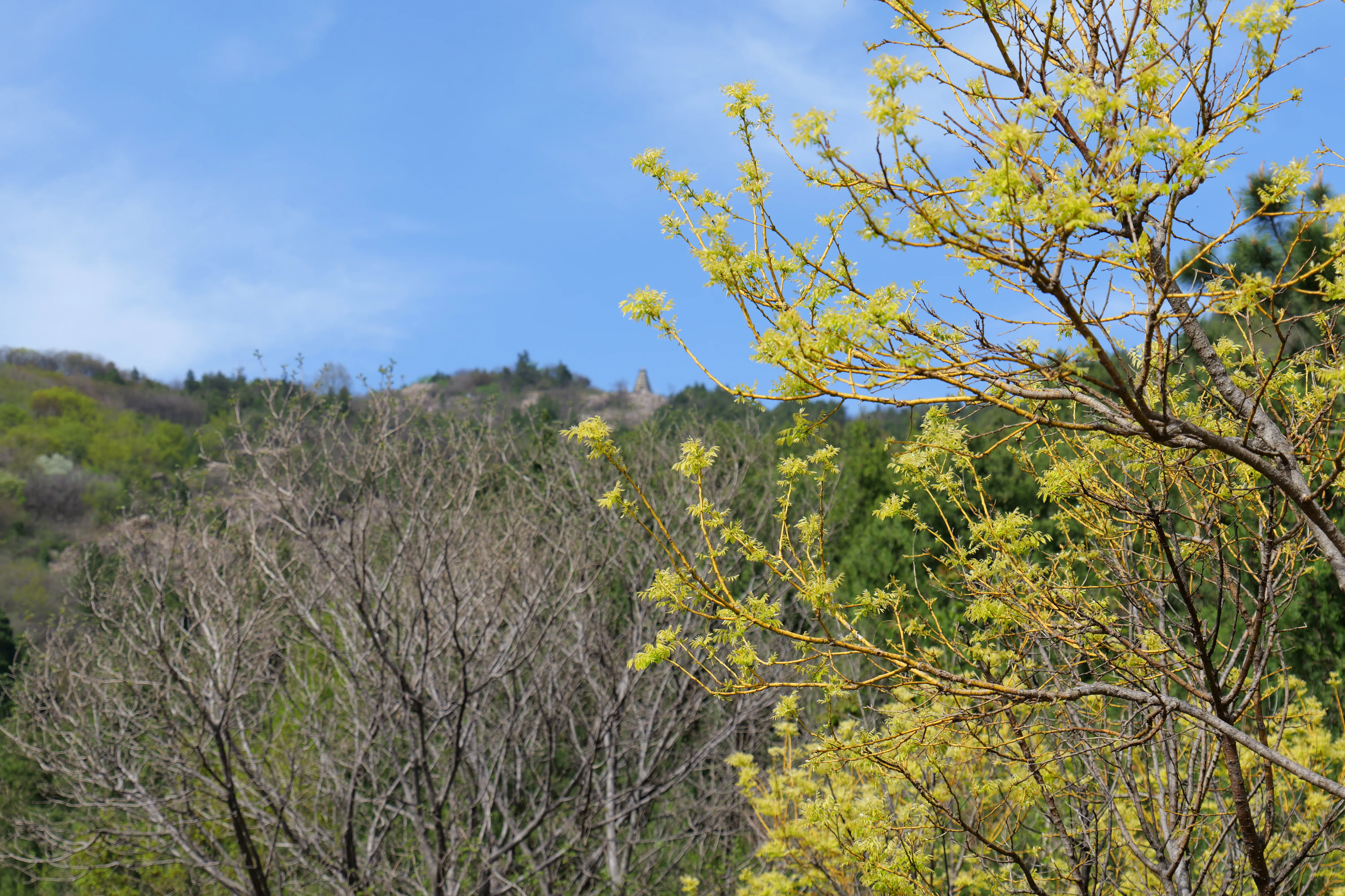 进入景区可以选择做观光车直接去爬山台阶的起点,10元一个人,自己走过去大概30分钟左右的时间(我们一边走一边拍照,比较慢),路上风景还可以,有花可以看。从山脚可以直接看到山顶有个塔,还是有点点高度的。