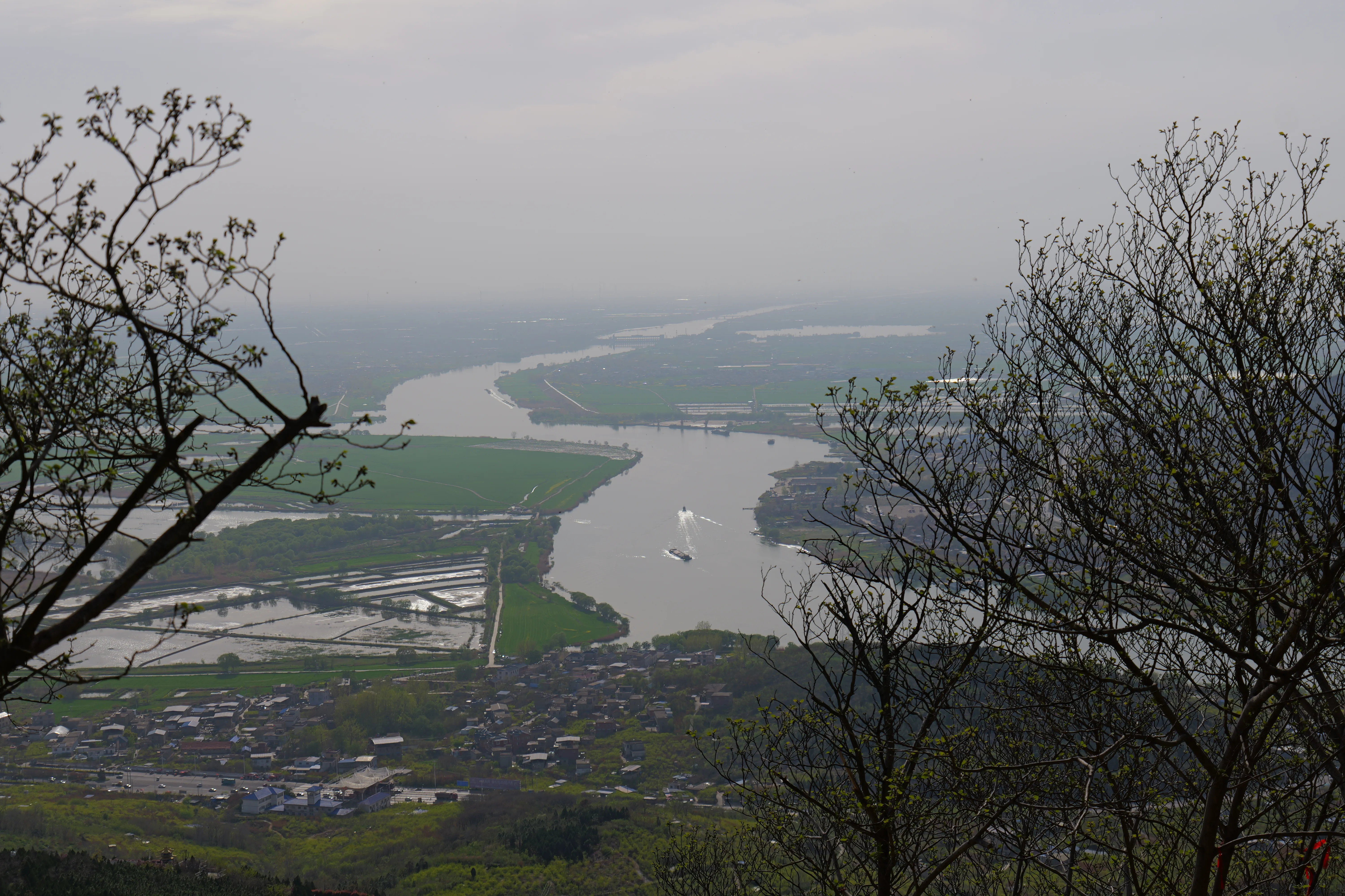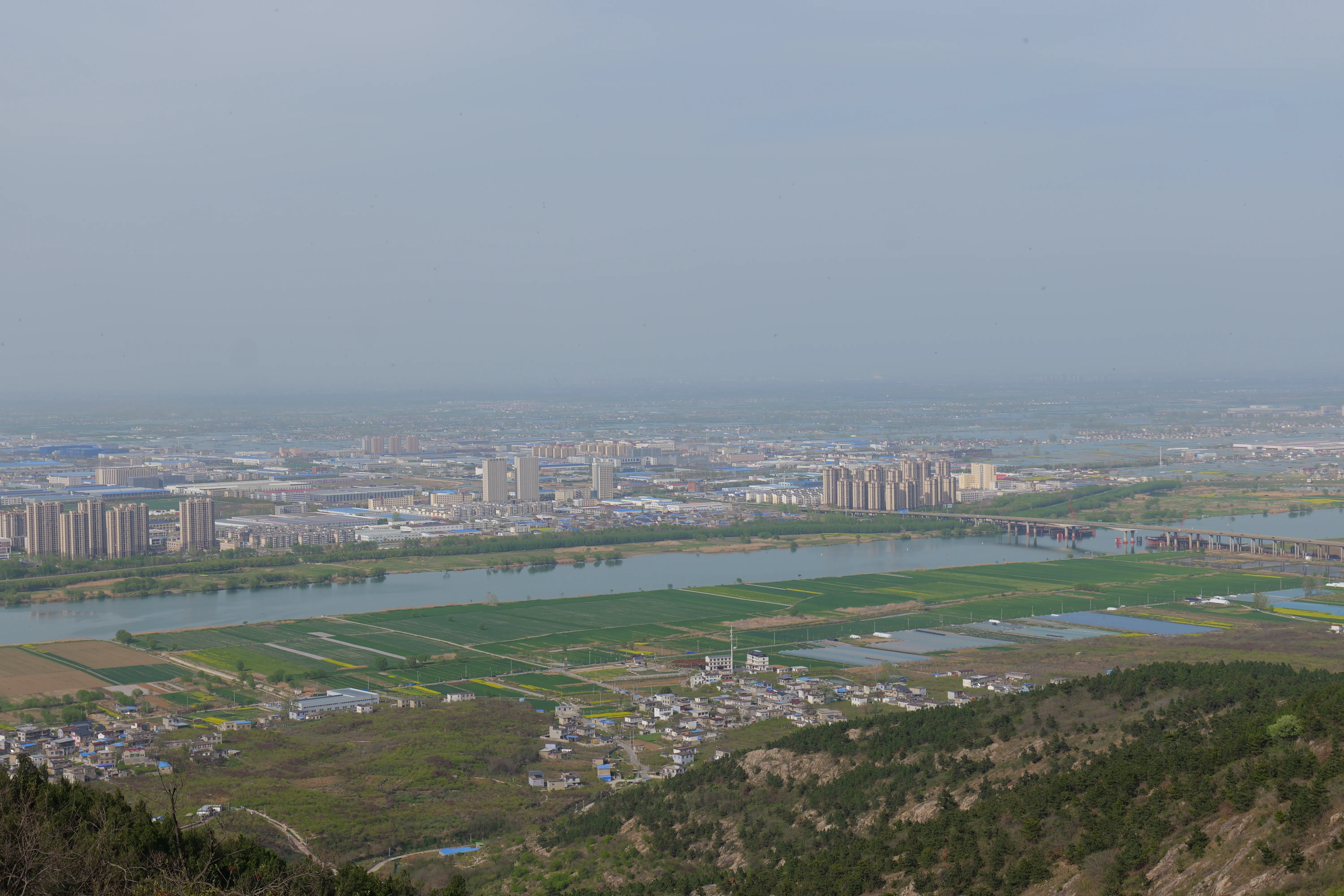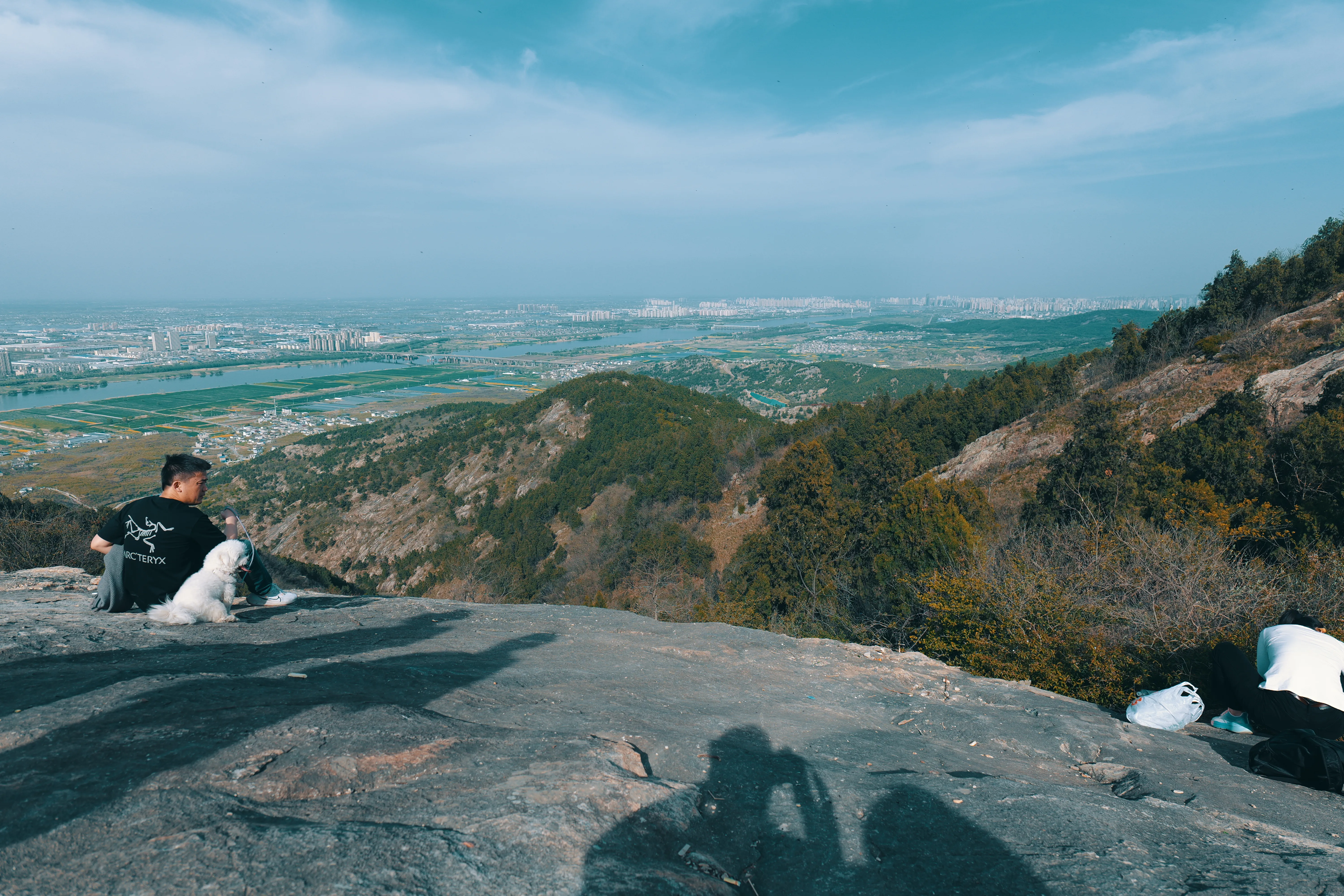 爬到山顶,有很大片的地方可以休息,大片的石头,视野也很好,可以看到下面的怀远县。可惜天气一般,雾蒙蒙的。