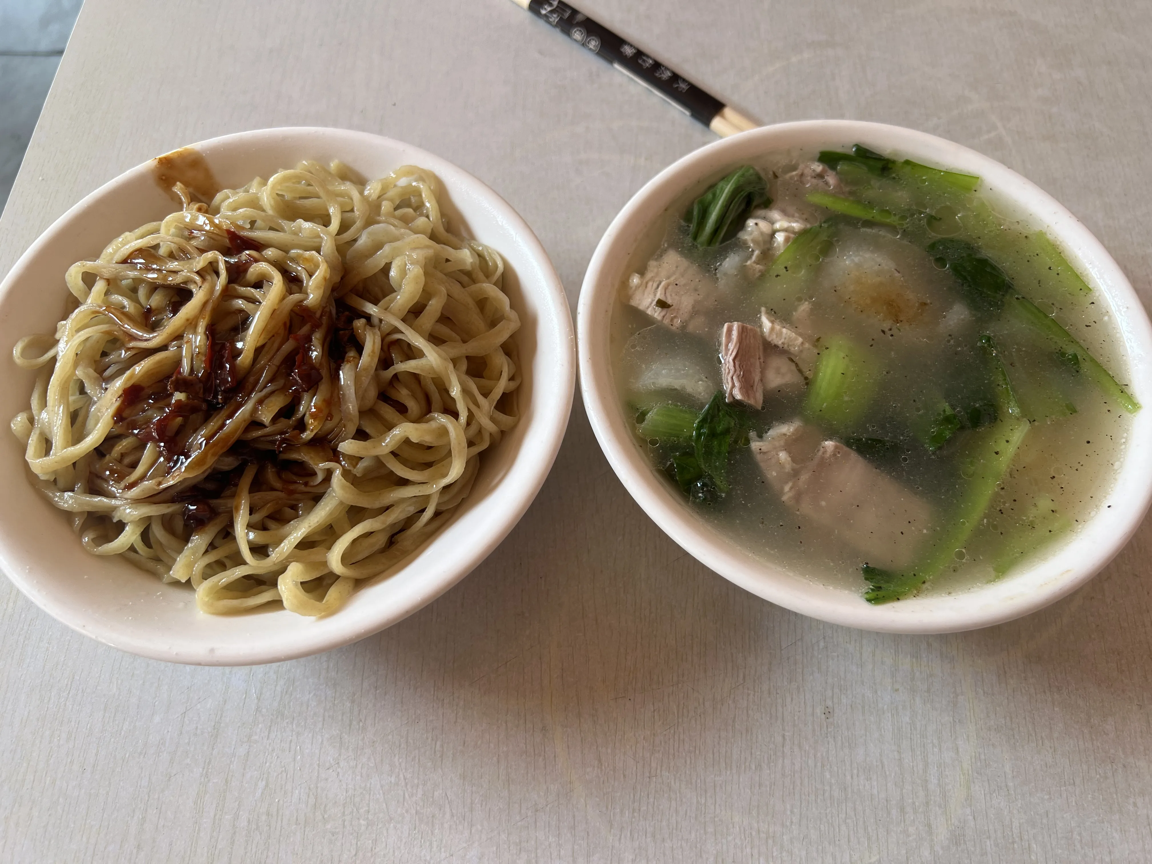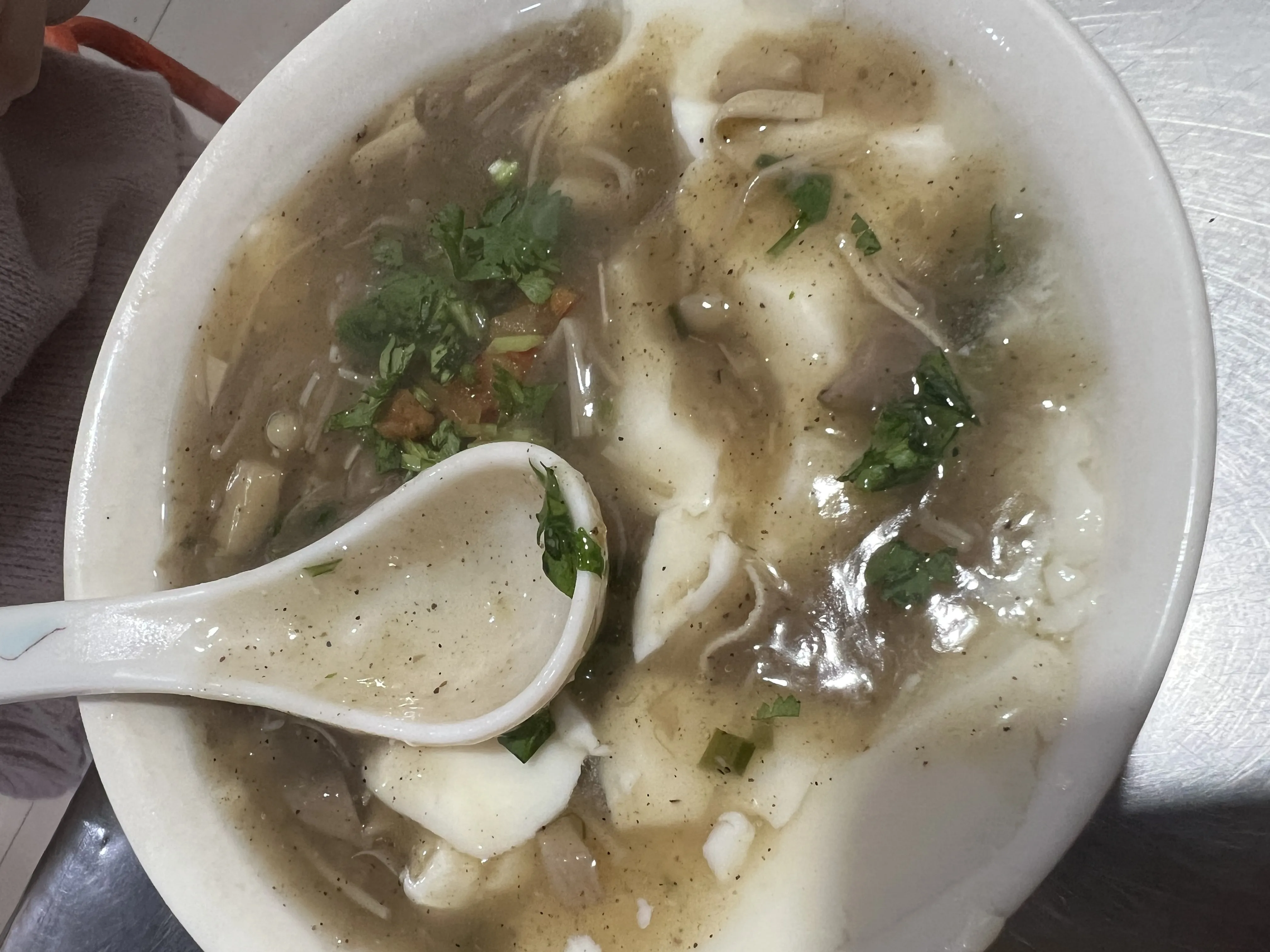 这家的三鲜干扣,是给两碗,一碗面,一碗三鲜汤。汤味道还可以,比较清口,只有食材的味道和一些盐调味,靠青菜本身的味道作为主体。