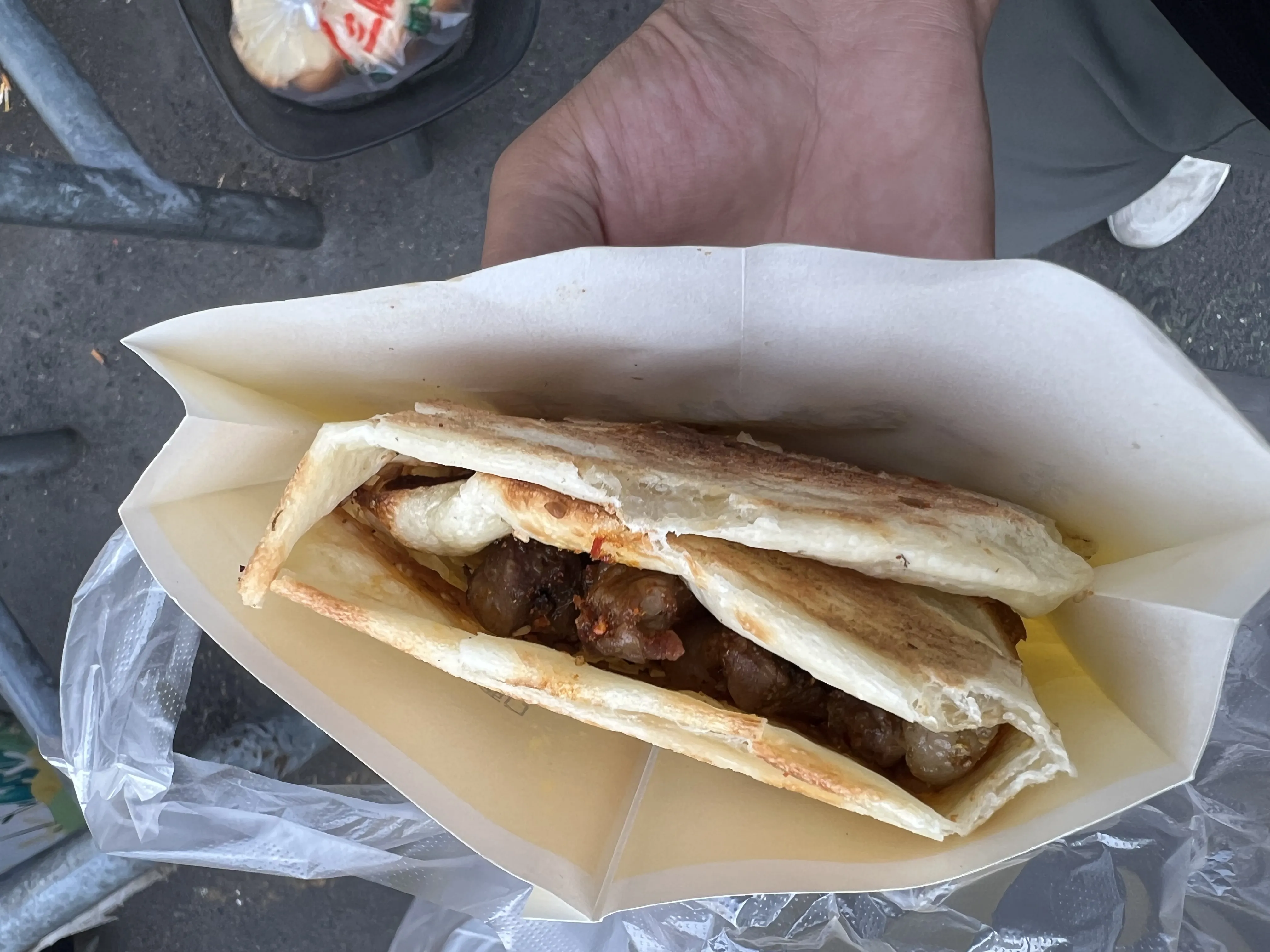 张公山结束,也到时间了,回到这个街,尝尝这个烧饼夹羊肉串。